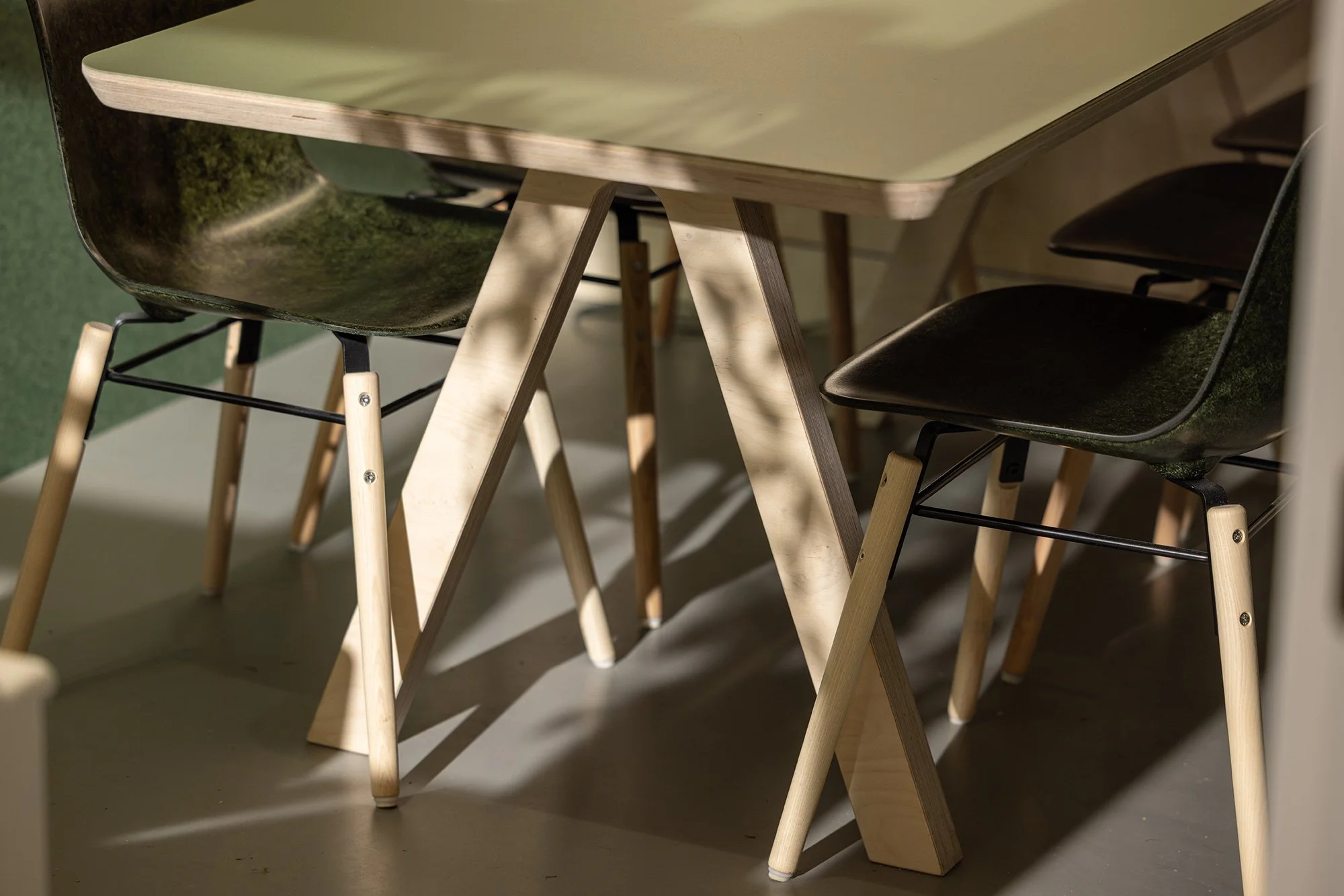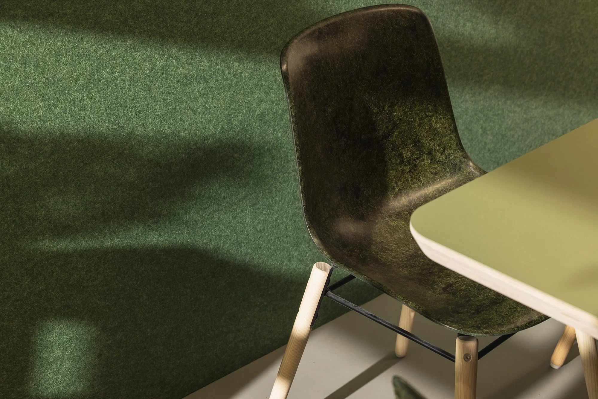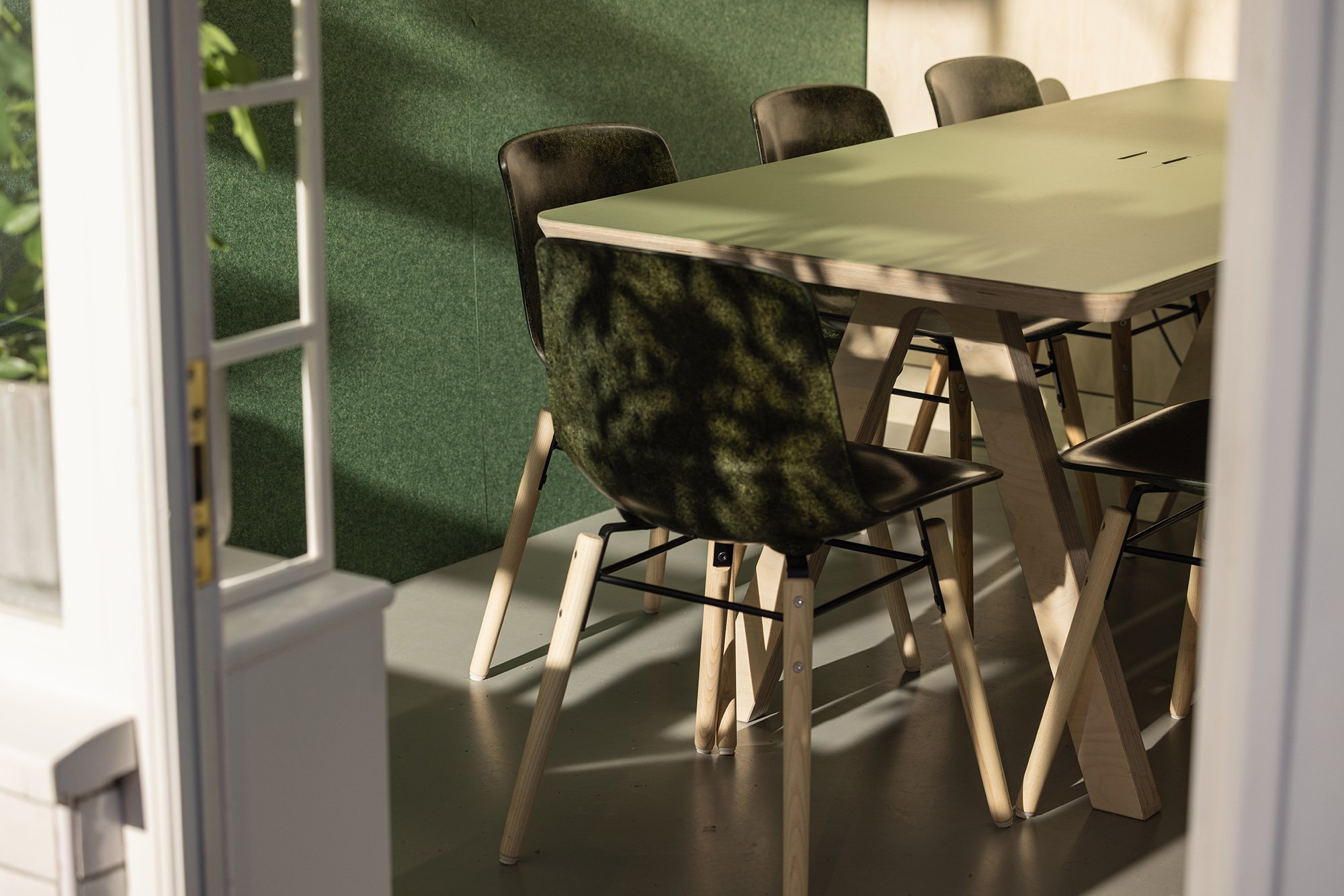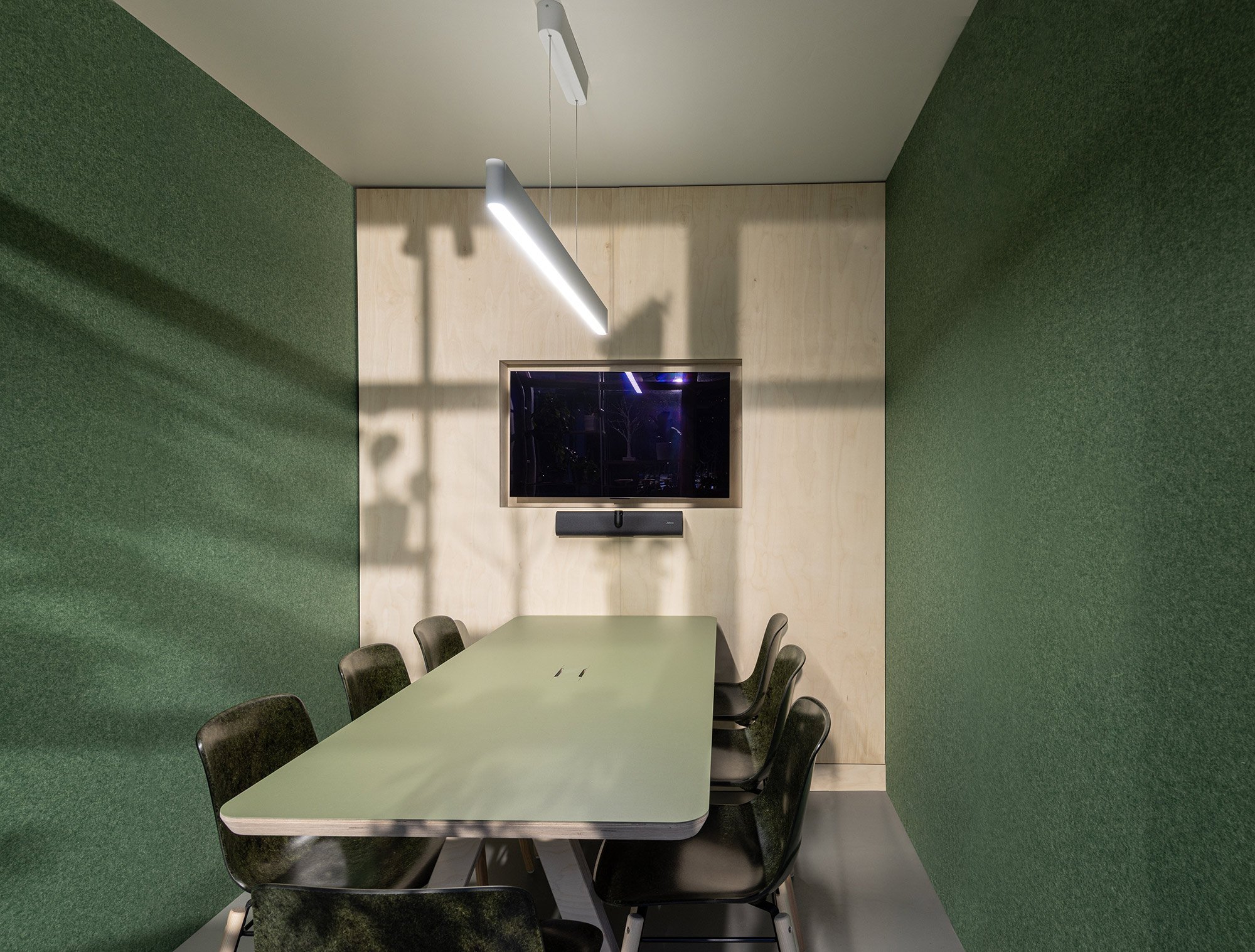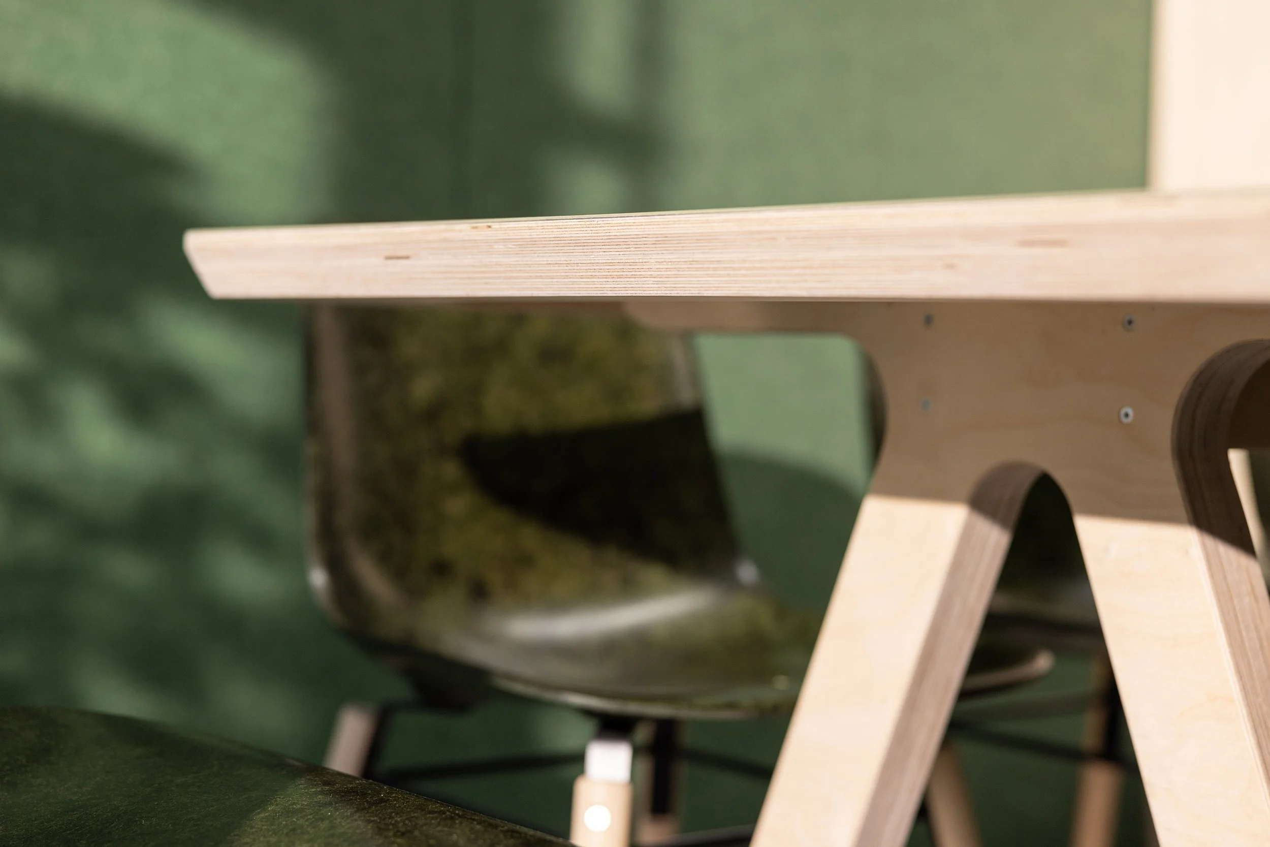 I chose the Forest colourway. It complements the greenery and natural materials used throughout SouthSpace, the birch plywood, soft neutrals and subtle tones that define the space. The colour has depth without dominating and helps tie the meeting room to the rest of the interior.